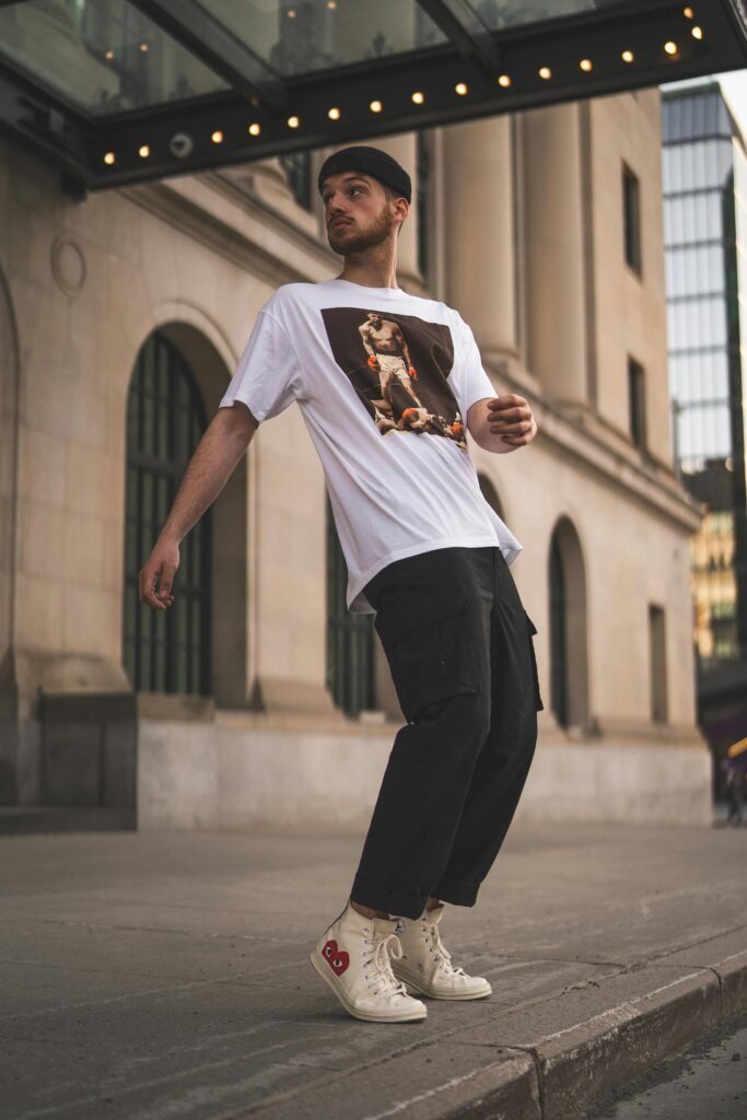 A graphic t-shirt paired with black pants creates an easy everyday outfit with a streetwear edge.
